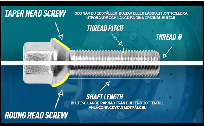 OBS TÄNK PÅ ATT KONTROLLERA LÄNGD OCH UTFÖRANDE PÅ DINA ORIGINALBULTAR INNAN DU BESTÄLLER LÅSBULTAR, LÄNGDEN PÅ VÅRA BULTAR RÄKNAS FRÅN BULTENS BOTTEN UPP TILL ANLÄGGNINGSYTAN. SE BILD